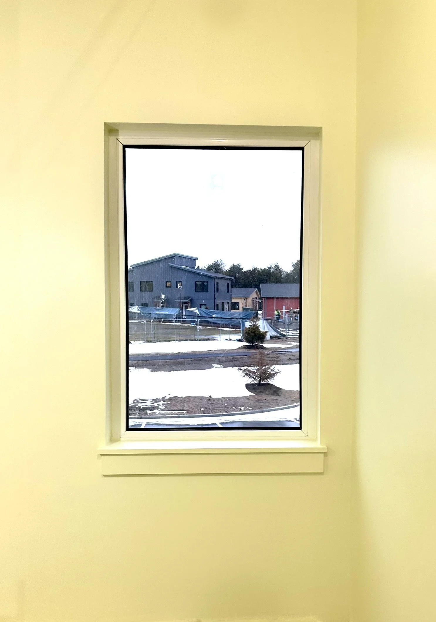 First, our group entered one of the 2-bedroom, 1-1/2-bath units of a duplex in the Upper Village. The apartment was on two floors. The first floor had an open living room, a decent kitchen, and a half-bathroom. The second floor featured a full bathroom and two spacious bedrooms, each with appropriate closets. The entire apartment was well-lit with large windows and a high 9.5-foot ceiling. The window treatments were already installed, ready to provide privacy and insulation as needed, and the windows could all be opened. The windows on both floors had lovely views of the surrounding undisturbed woods. I appreciated very much that all the windows that I saw could be opened. On the first floor, I noticed that the heating vents were near the ceiling rather than the floor. Later, Jay shared that the buildings use an air circulator to move the heated air around and also to compensate for the very tight energy-efficient seal on the apartments. As a testament to the tight seal, although the heat was not on, we felt quite comfortable in the apartment when the outside temperature was 38°F (3°C). There is more on energy efficiency later in this article.